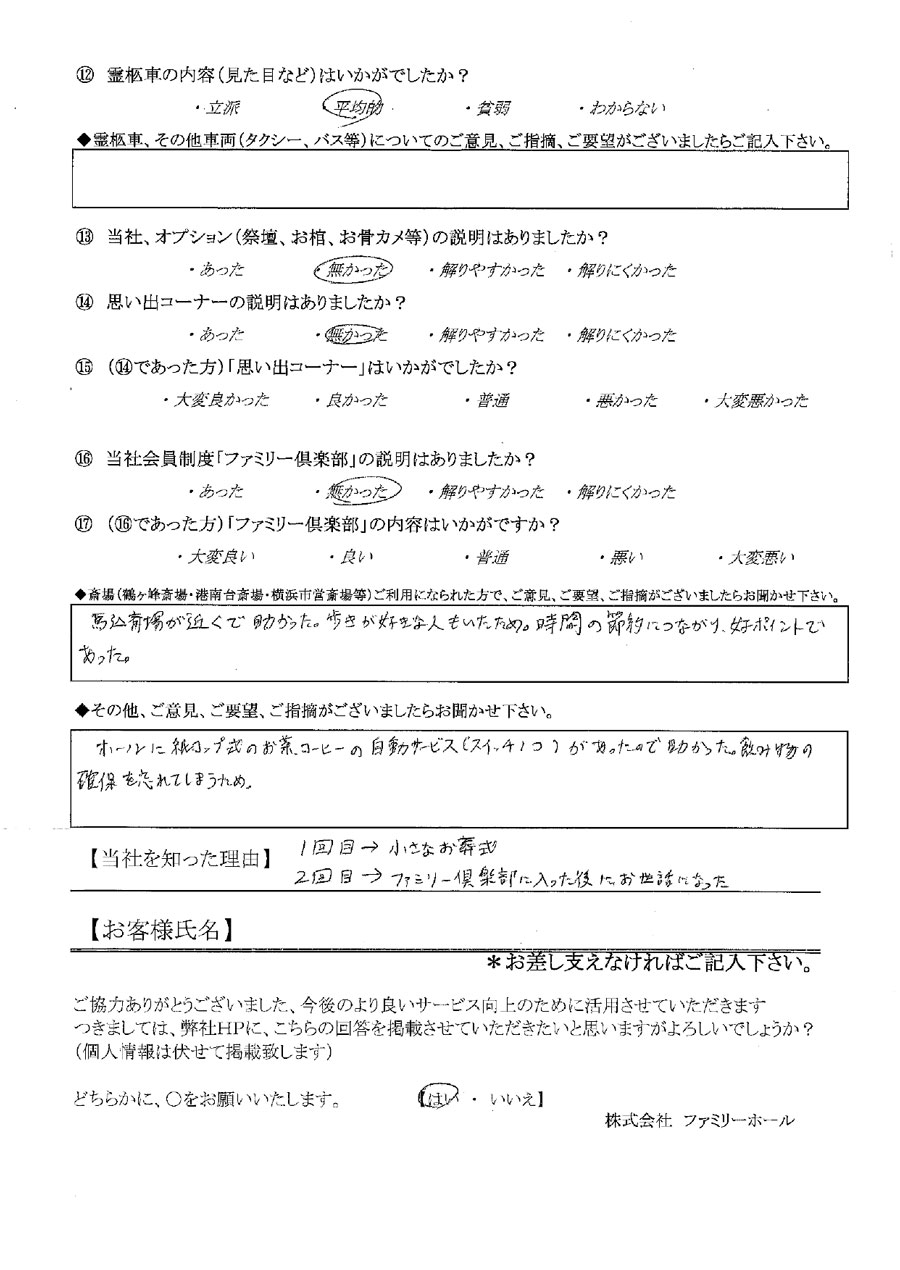 【お客様の声】馬込斎場が近くで助かりました。歩きが好きな人もおり、時間の短縮にもなりました。 2022 10/18 お客様よりの大切なお声を頂戴いたしました。 スタッフ一同、全身全霊を尽くしてご奉仕いたします。 分からないこと、ご不安なことがあれば、遠慮なく、いつでもご相談ください。 お客様よりの大切な声 お客様よりの大切なお声を頂戴いたしました。 お客様よりの大切なお声を頂戴いたしました。