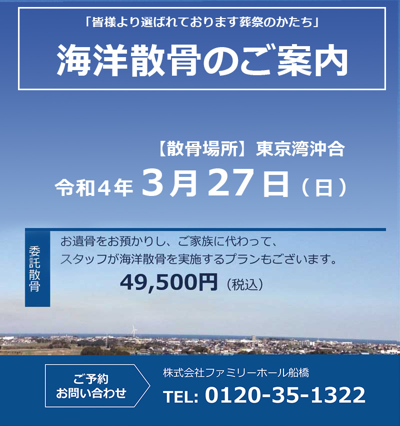 千葉県船橋市にて地域密着で細やかなサポートにこだわったご葬儀・お別れ式を行う葬儀社・ファミリーホール船橋です。 合同・委託散骨の次回出港日についてお知らせいたします。 日程 : 令和5年3月4日 (土) 11:00出港 出港場所 : 横浜みなとみら... -