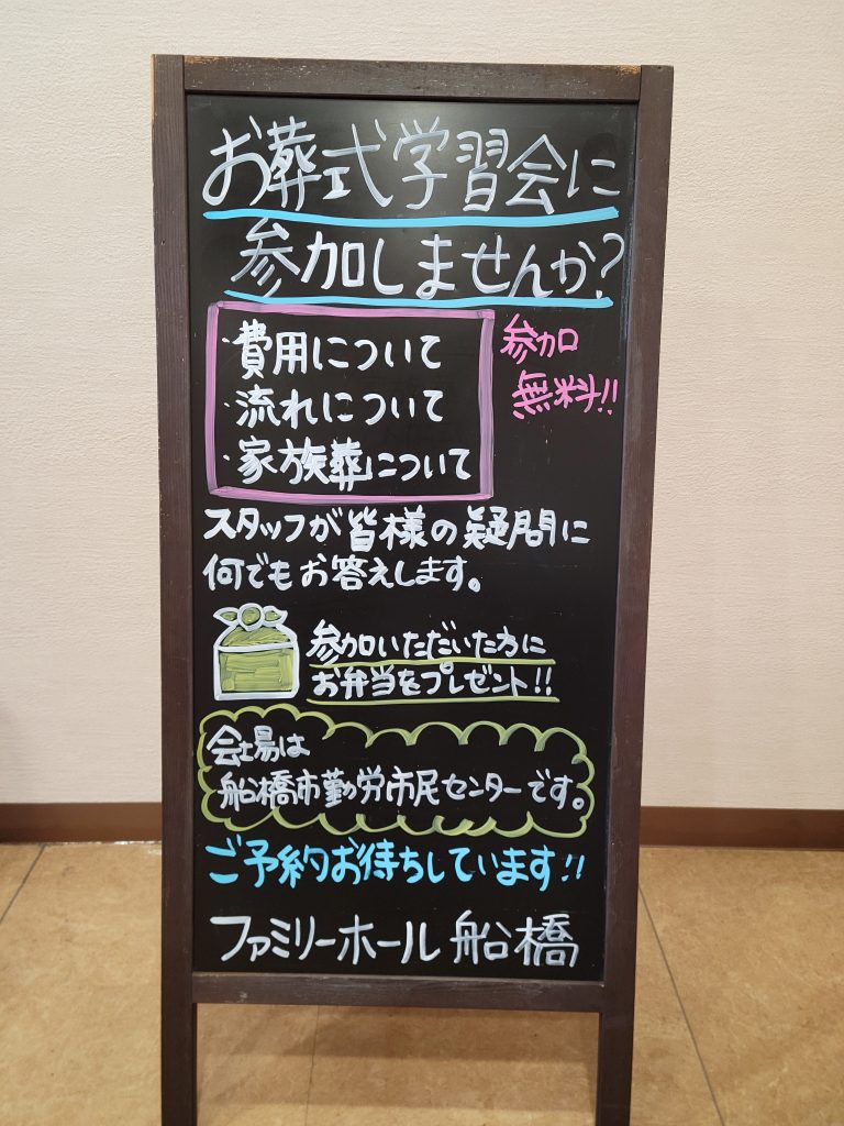ファミリーホール船橋のホームページをご覧いただきありがとうございます。 ファミリーホール船橋入口前に設置してありますブラックボードの内容を更新いたしました。 ぜひご覧になってくださいね。 お葬式学習会の次回開催につきましてご案内いたします。... -