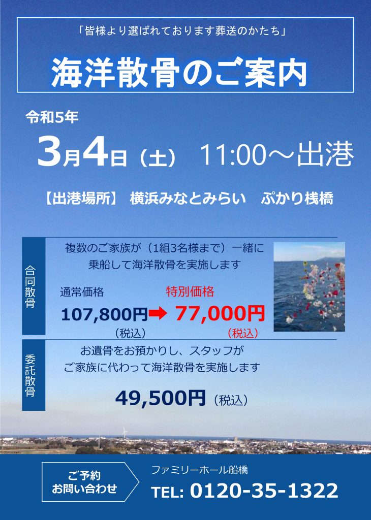 【海洋散骨のご案内(合同・委託散骨)】令和5年3月4日 (土) 横浜みなとみらい ぷかり桟橋