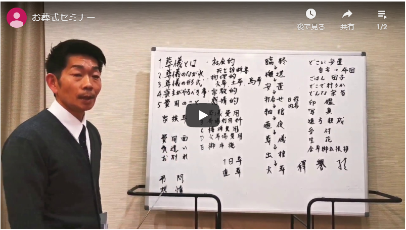 お葬式にまつわることを動画にしました。 葬儀とは、葬儀のながれ、葬儀の形式、喪主がやるべき事、費用のことなどなど…。 ご参考までにぜひご覧ください。 [su_youtube_advanced url="https://youtu.be/qER6x9n0PpQ" controls="alt" loop="yes" rel="no"] -