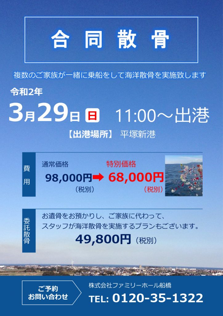 【合同・委託散骨のお知らせ】令和2年3月29日(日)「平塚新港」11:00〜出港