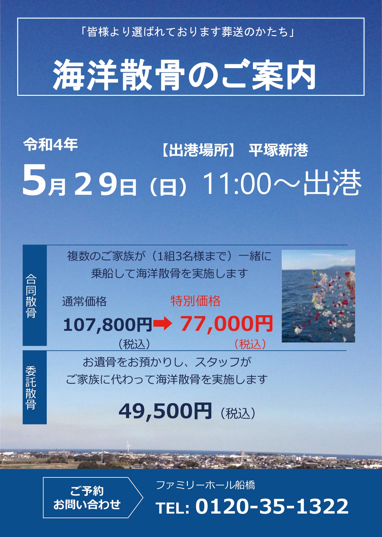 【海洋散骨のご案内(合同・委託散骨)】令和4年5月29日 (日) 平塚新港出港