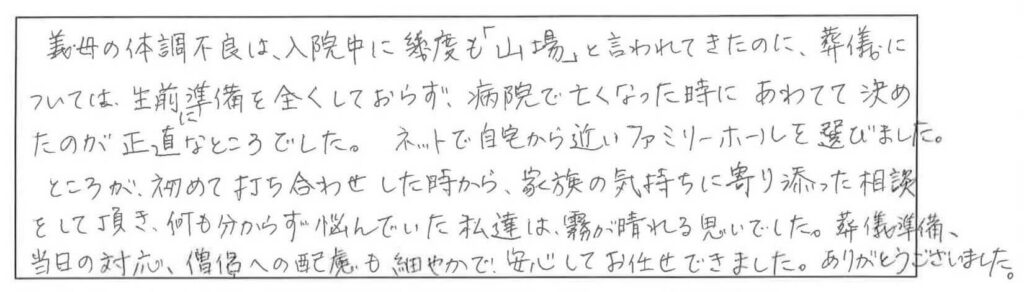 義母の体調不良は、入院中に幾度も「山場」と言われてきたのに、葬儀については、生前に準備を全く準備をしておらず、病院で亡くなった時にあわてて決めたのが正直なところでした。ネットで自宅から近いファミリーホールを選びました。ところが、初めて打ち合わせをした時から家族の気持ちに寄り添った相談をして頂き、何も分からず悩んでいた私達は、霧が晴れる思いでした。葬儀準備、当日の対応、僧侶への配慮も細やかで安心してお任せできました。ありがとうございました。