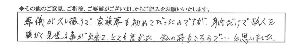 葬儀が久しぶりで、家族葬も初めてだったのですが、身内だけで故人を温かく見送ることが出来てとても良かった。私の時もこちらで…と思いました。